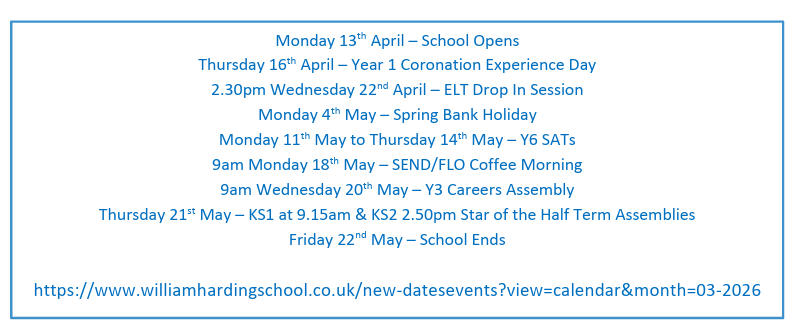 These are the events for this half term. Further details, including times, can be found in the letters below.
