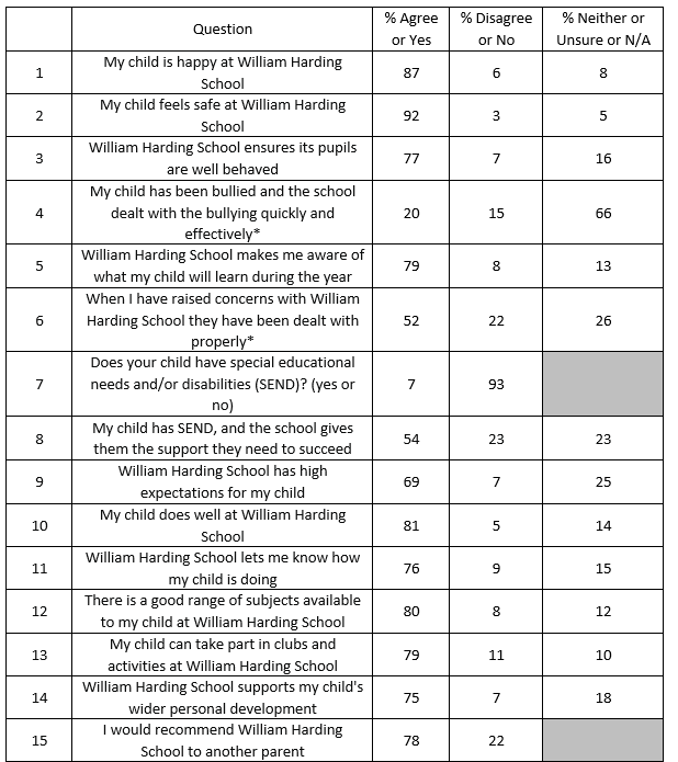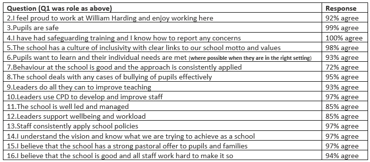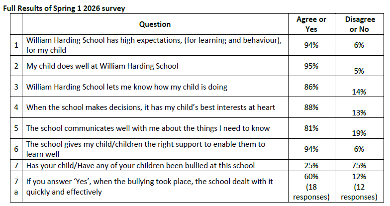 These results reflect the hard work and dedication of our staff, the support of our parents, and the positive attitude of our pupils. We will use the results and comments made by the pupils, both positive and constructive, to help support the Leadership Team to further enhance the fantastic educational provision on offer at William Harding.
