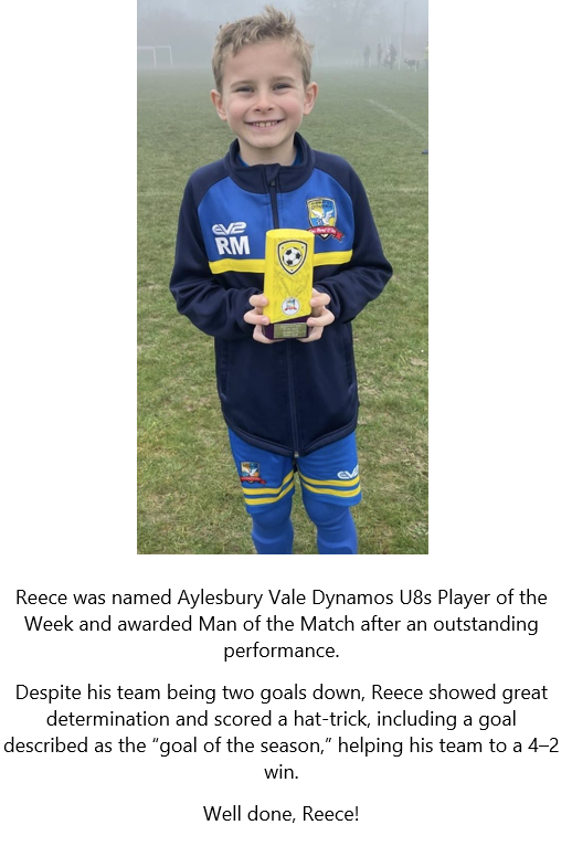James in Cliveden class was awarded man of the match this weekend for his excellent defending skills for his team Aylesbury Vale Dynamos youth. Well done James!